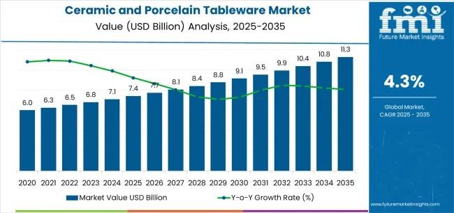 The global Ceramic and Porcelain Tableware Market is on a steady growth trajectory, expected to expand from a valuation of USD 7.4 billion in 2025 to USD 11.3 billion by 2035, reflecting a compound annual growth rate (CAGR) of 4.3%. This growth is driven by evolving consumer preferences, lifestyle changes, and an increasing focus on premium dining aesthetics across residential and commercial sectors worldwide.