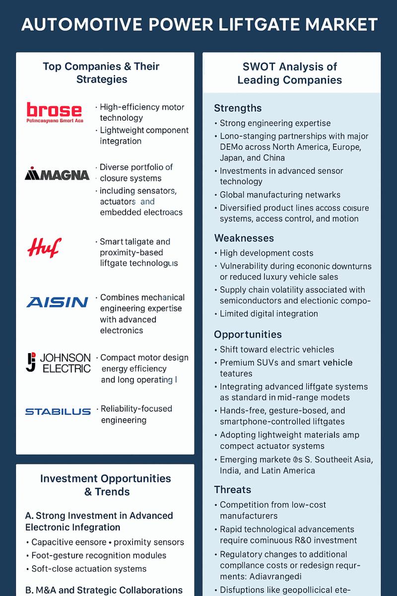 The automotive power liftgate market is undergoing rapid transformation driven by increasing adoption of advanced vehicle convenience features, rising expectations for hands-free functionality, and greater integration of electronics and smart sensors in modern vehicles. Automakers and Tier-1 suppliers are innovating to differentiate vehicle user experience, reduce mechanical complexity, and enhance safety. In this competitive landscape, manufacturers are strengthening global presence, improving system reliability, and expanding product portfolios tailored for passenger…