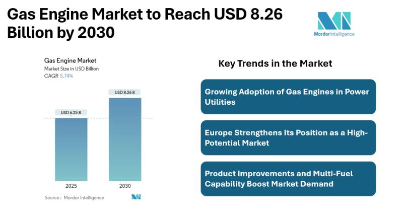 The global gas engine market is forecast to grow from USD 6.25 billion in 2025 to USD 8.26 billion by 2030, registering a CAGR of 5.74%. Demand is supported by the need for cleaner and more dependable power solutions across key sectors.Browse Full Report Details Followed by TOC: https://www.mordorintelligence.com/industry-reports/gas-engine-market?utm_source=openpr