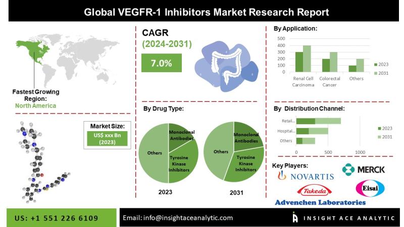 InsightAce Analytic Pvt. Ltd. announces the release of a market assessment report on the "Global VEGFR-1 Inhibitors Market- (By Drug Type (Monoclonal Antibodies, Tyrosine Kinase Inhibitors, and Others), By Application (Renal Cell Carcinoma, Colorectal Cancer, Non-Small Cell Lung Cancer, and Other), Distribution Channel (Hospital Pharmacies, Retail Pharmacies and Online Pharmacies)), By Region, Trends, Industry Competition Analysis, Revenue and Forecast To 2031."