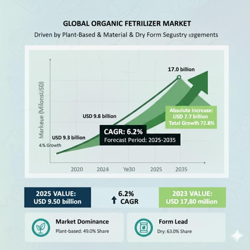 The global organic fertilizer market is poised for robust expansion through 2035, fueled by escalating demand for sustainable agriculture, soil regeneration, and chemical-free food production. According to Future Market Insights (FMI), the market is valued at USD 9.3 billion in 2025 and is projected to reach USD 17.0 billion by 2035, advancing at a compound annual growth rate (CAGR) of 6.2%.The FMI report, "Organic Fertilizer Market | Global Market Analysis Report - 2035," reveals an absolute revenue increase of USD 7.7 billion over the forecast period, nearly 1.8 times the current size. This surge is propelled by investments in eco-friendly nutrient systems, government-backed organic certification programs, and the global push toward carbon-neutral farming practices.