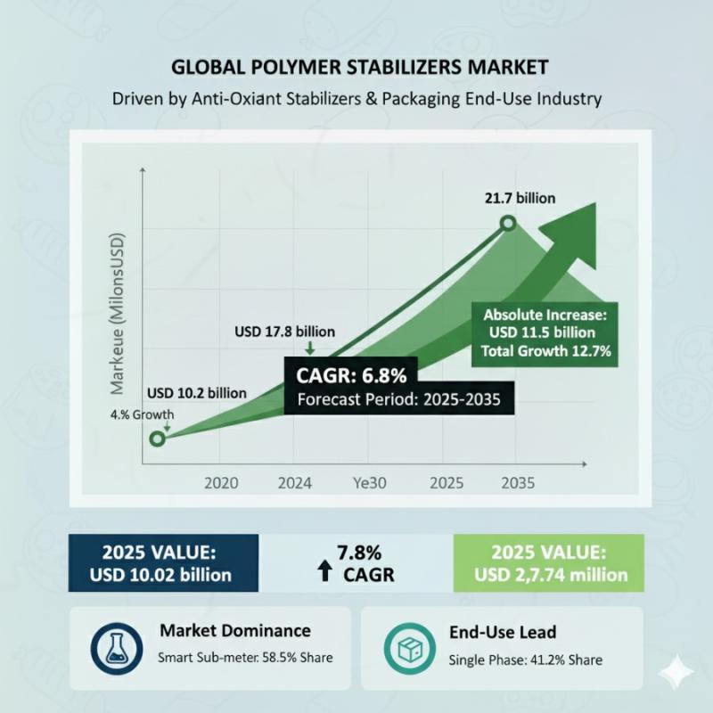 The global polymer stabilizers market is poised for robust expansion through 2035, fueled by escalating needs for durable, high-performance polymers in packaging, automotive, and construction sectors. According to Future Market Insights (FMI), the market is valued at USD 10.2 billion in 2025 and is projected to hit USD 21.7 billion by 2035, growing at a compound annual growth rate (CAGR) of 7.8%.