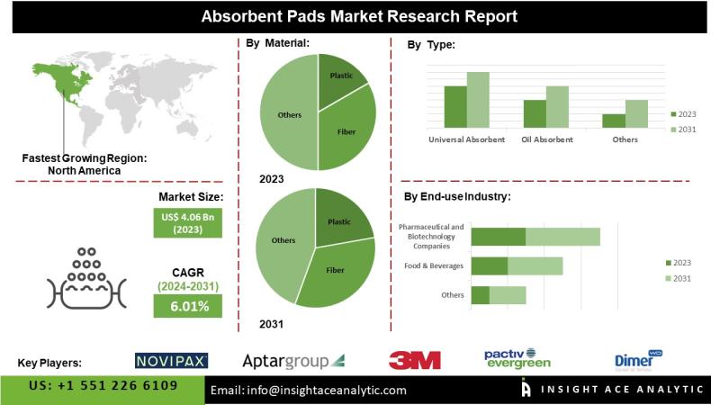InsightAce Analytic Pvt. Ltd. announces the release of a market assessment report on the "Global Absorbent Pads Market - (By Material (Plastic (Polyethylene, Polypropylene, Superabsorbent Polymer), Fiber, Paper, Other Materials), By Type (Universal Absorbent Pads, Oil Absorbent Pads, Hazmat Absorbent Pads, Chemical Absorbent Pads, Other Absorbent Pads), By Absorbency Weight (Light Weight, Medium Weight, Heavy Weight), By End Use Industry (Healthcare, Food & Beverages, Chemical, Pharmaceutical, Manufacturing, Automotive, Agriculture, Oil & Gas, Other End-use Industries)), Trends, Industry Competition Analysis, Revenue and Forecast To 2031."According to the latest research by InsightAce Analytic, the Global Absorbent Pads Market is valued at US$ 4.06 Bn in 2023, and it is expected to reach USD 6.01 Bn by the year 2031 , with a CAGR of 5.19% during the forecast period of 2024-2031.