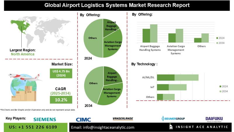 InsightAce Analytic Pvt. Ltd. announces the release of a market assessment report on the "Global Airport Logistics Systems Market - (By Offering (Airport Baggage Handling Systems (Check-in Systems, Conveyors, Scanner Systems, Security Screening, Sorting Systems, Early Baggage Storage, Baggage Transport Systems, Baggage Reclaim Carousels, Other Airport Baggage Handling Systems), Aviation Cargo Management Systems (Warehouse and Operational Management Systems, Freight Information Systems, Aviation Cargo Screening Systems, Cargo Sales and Reservation Management Systems, Other Aviation Cargo Management Systems), Services (Support and Maintenance, System Integration and Deployment, Consulting)), Technology (IoT, RFID, AI/ML/DL, big data, robotics & automated systems, Scanners & Detectors, Others)), Trends, Industry Competition Analysis, Revenue and Forecast To 2034."According to the latest research by InsightAce Analytic, the Global Airport Logistics Systems Market Size is valued at USD 4.75 Billion in 2025 and is predicted to reach USD 12.44 Billion by the year 2034 at a 10.2% CAGR during the forecast period for 2025-2034.