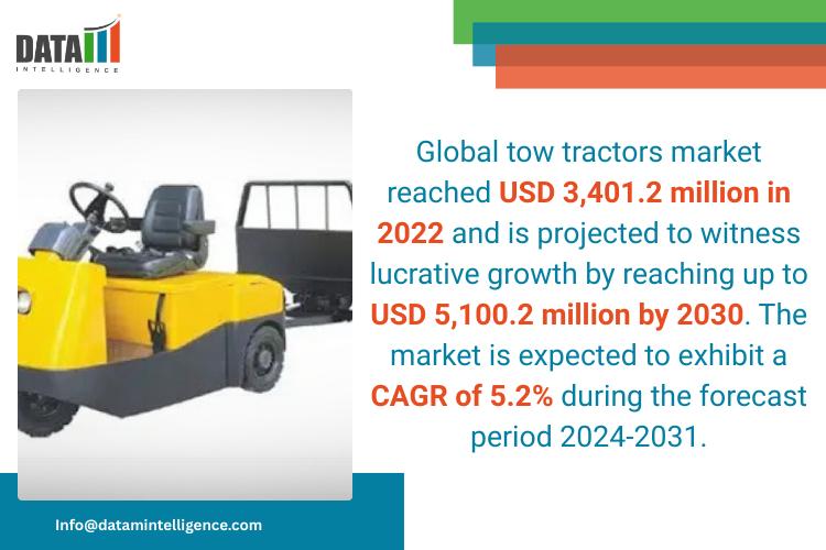 Global tow tractors market reached USD 3,401.2 million in 2022 and is projected to witness lucrative growth by reaching up to USD 5,100.2 million by 2030. The market is expected to exhibit a CAGR of 5.2% during the forecast period (2024-2031).