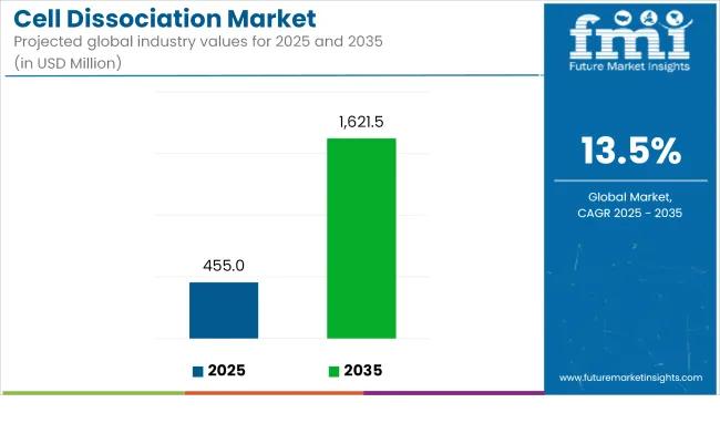 The Cell Dissociation Market is valued at USD 455.03 million in 2025 and is projected to reach USD 1621.47 million by 2035, registering a CAGR of 13.5%. The industry's momentum is strengthened by regulatory alignment, growing biopharma manufacturing needs, and innovations in enzymatic and non-enzymatic dissociation. Across Europe and the U.S., rising research funding continues to support scalable, AI-enabled dissociation methods essential for precision medicine and regenerative therapies.