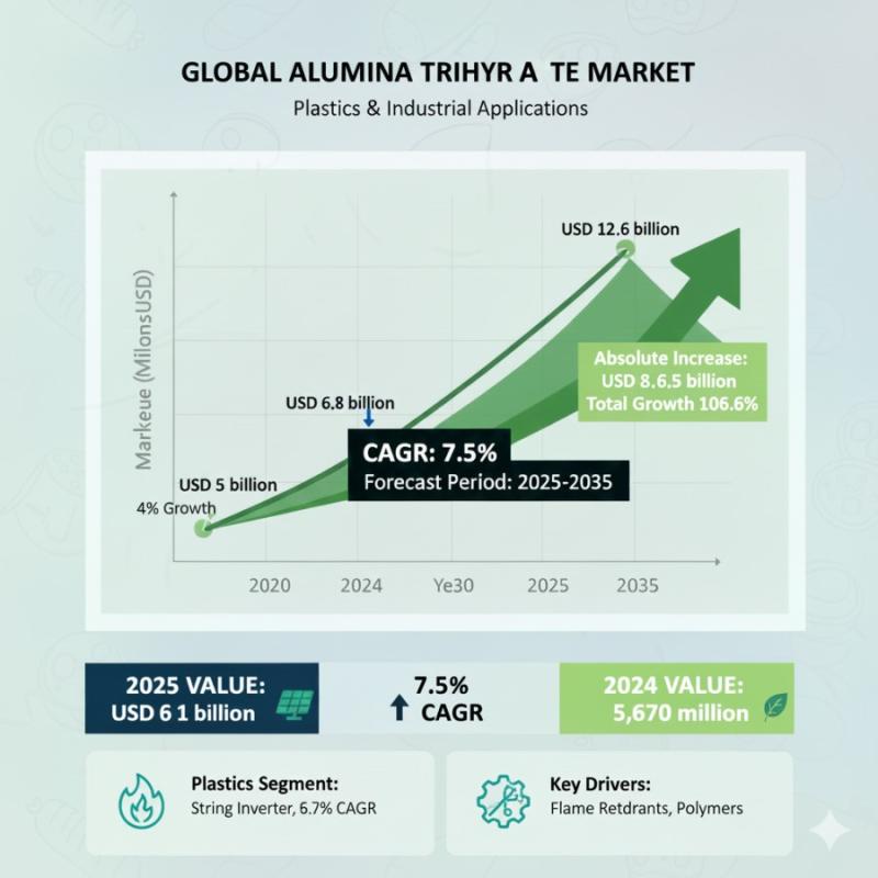 The global alumina trihydrate market is set for sustained growth through 2035, powered by stricter fire safety regulations, eco-friendly material adoption, and expanding applications in plastics and electronics. According to Future Market Insights (FMI), the market is valued at USD 6.1 billion in 2025 and is projected to reach USD 12.6 billion by 2035, expanding at a compound annual growth rate (CAGR) of 7.5%.