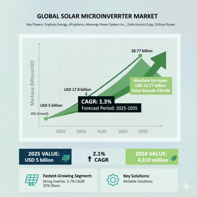 The global solar microinverter market is set for sustained growth through 2035, powered by residential PV adoption, panel-level optimization, and supportive net-zero policies. According to Future Market Insights (FMI), the market is valued at USD 5.0 billion in 2025 and is projected to reach USD 26.77 billion by 2035, expanding at a compound annual growth rate (CAGR) of 18.3%.