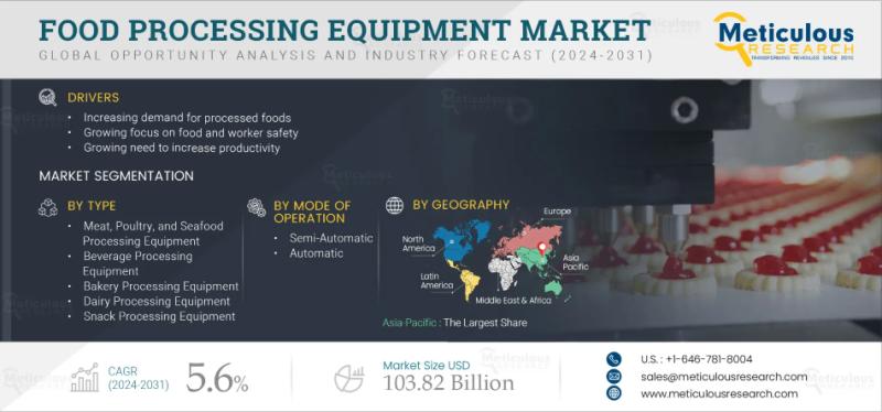 The global food processing equipment market is poised for significant growth in the coming years. Analysts predict it will surpass USD 100 billion by 2031, with millions of units in operation worldwide. This surge is largely fueled by an ever-growing demand for processed foods, technological advancements in equipment, and a strong emphasis on improving both food and worker safety. Food manufacturers are increasingly investing in machinery that boosts productivity, reduces operational costs, and aligns with modern consumer expectations. The shift in lifestyle patterns urbanization, busier schedules, and a preference for ready-to-eat meals has played a major role in driving the demand for processed foods. At the same time, government initiatives in several regions to modernize food production have provided additional support to the market. However, challenges remain, such as the high cost of advanced equipment and a shortage of skilled operators, particularly in emerging economies.Download Sample Report Here: https://www.meticulousresearch.com/request-sample-report/cp_id=5049