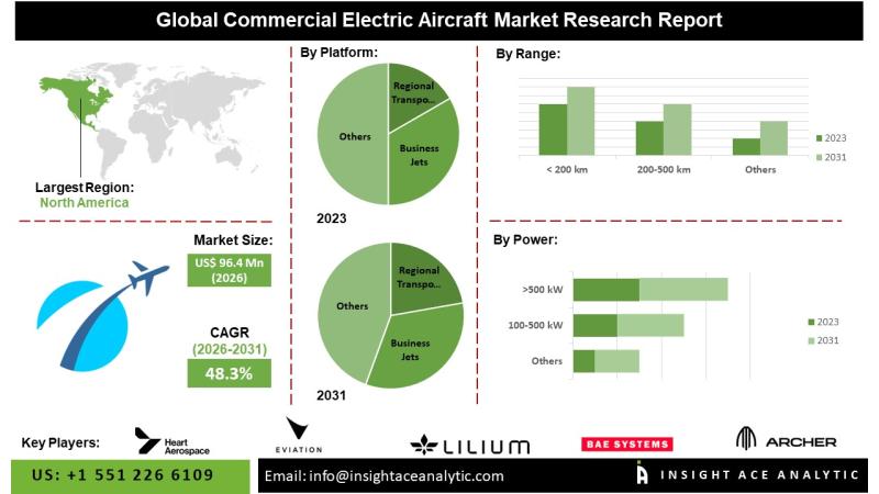 InsightAce Analytic Pvt. Ltd. announces the release of a market assessment report on the "Global Commercial Electric Aircraft Market - (By Platform (Regional Transport Aircraft (20-40 SEATS, >40 SEATS), Business Jets (500 km), By Power (100-500 kW, >500 kW)), Trends, Industry Competition Analysis, Revenue and Forecast To 2031."