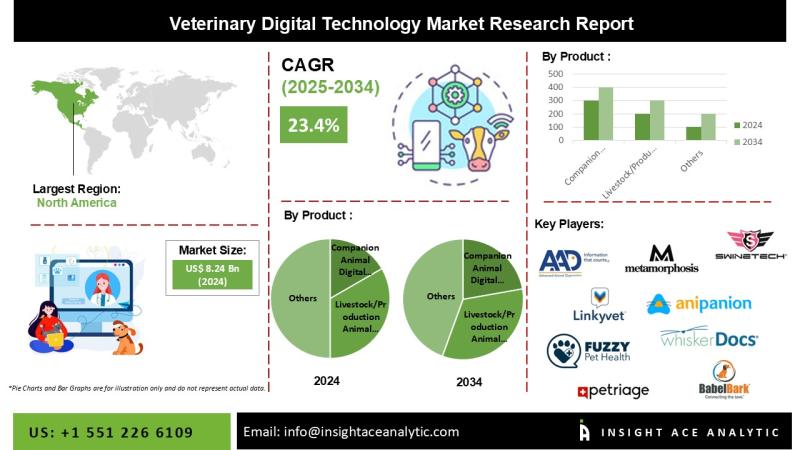 InsightAce Analytic Pvt. Ltd. announces the release of a market assessment report on the "Global Veterinary Digital Technology Market- by Product Type (Companion Animal Digital Technology (Telemedicine, Telehealth, Reminder Applications, Trackers, Wearables, and Platform Marketplaces) and Livestock/Production Animal Digital Technology(Monitoring Devices, Identification Devices, Trackers, Wearables, Remote Sensors, Digital Cameras, Microphones, and Environmental Sensors)), Trends, Industry Competition Analysis, Revenue and Forecast To 2034."According to the latest research by InsightAce Analytic, the global Veterinary Digital Technology Market Size is valued at USD 8.24 Mn in 2024 and is predicted to reach USD 66.35 Mn by the year 2034 at an 23.4% CAGR during the forecast period for 2025-2034.