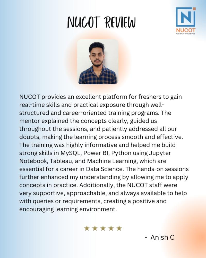 NUCOT is frequently appreciated for its mock interviews, resume-building sessions, and technical assessments. These are especially helpful for beginners and for those coming from non-IT backgrounds. Learners often mention that this structured preparation improves confidence and boosts their chances during the hiring process-an important part of any data science course with placement in Bangalore.