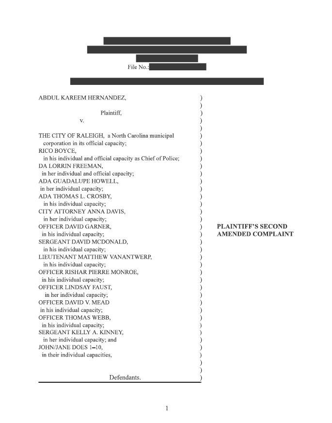 The filing, submitted by plaintiff Abdul Kareem Hernandez, names more than a dozen Raleigh officials and supervisory personnel. The lawsuit is now positioned to draw national attention due to allegations of constitutional violations, prosecutorial misconduct, and multi-year delays in disclosing critical law-enforcement records.