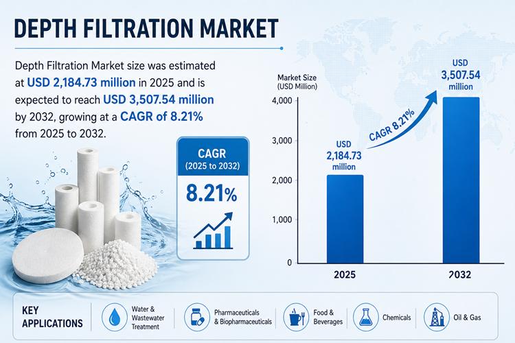 The global Depth Filteration Market size was estimated at USD 2,184.73 million in 2025 and is expected to reach USD 3,507.54 million by 2032, growing at a CAGR of 8.21% from 2025 to 2032. This steady expansion reflects increasing filtration requirements across industries, particularly in bioprocessing, where upstream clarification plays a critical role in ensuring product purity and process efficiency.