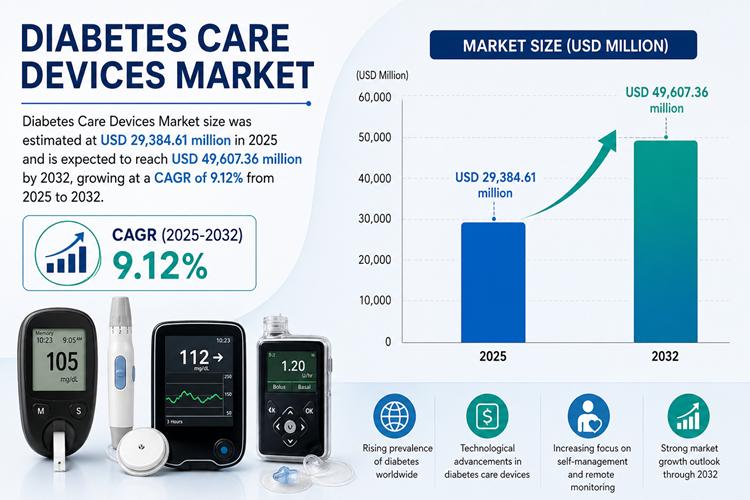 The global Diabetes Care Devices Market is experiencing robust growth as healthcare systems increasingly prioritize continuous monitoring, early diagnosis, and patient-centric care. The market size was estimated at USD 29,384.61 million in 2025 and is projected to reach USD 49,607.36 million by 2032, expanding at a CAGR of 9.12% from 2025 to 2032.
