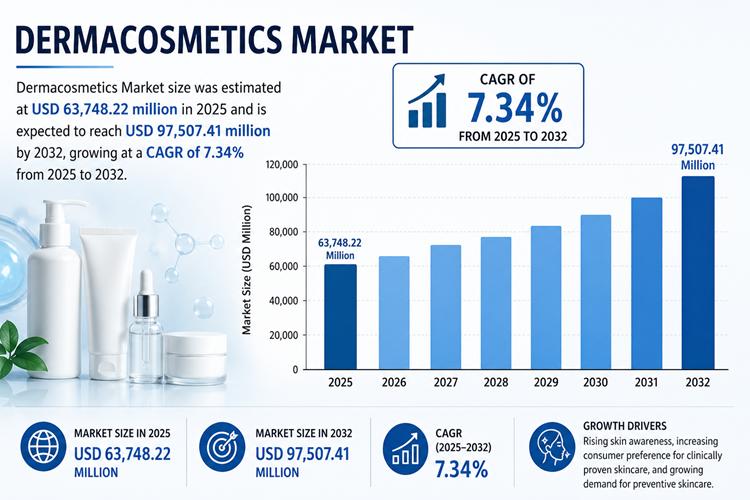 The Dermacosmetics Market has emerged as one of the most dynamic segments within the global skincare industry, blending dermatological science with cosmetic appeal. The global Dermacosmetics Market size was estimated at USD 63,748.22 million in 2025 and is expected to reach USD 97,507.41 million by 2032, growing at a CAGR of 7.34% from 2025 to 2032.