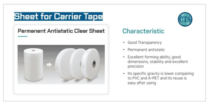 ChemTech Solution is a leader in Korea's precision packaging materials industry, focusing on innovative sheet solutions for carrier tape applications. Committed to quality, technology, and sustainability, the company is recognized by global electronics manufacturers. With advanced facilities and a skilled engineering team, the company adheres to high international standards through continuous R&D, offering solutions that improve the reliability and protection of electronic components during packaging and transport.The permanent antistatic clear sheet by ChemTech Solution is a pioneering product developed in Korea, specifically designed to address the increasing needs of contemporary electronic packaging. It features a unique three-layer structure that provides excellent transparency and adaptability while maintaining permanent antistatic qualities. This sheet protects delicate microelectronic parts, keeping their size and performance stable during manufacturing and shipping.