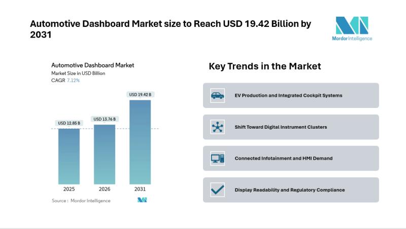 According to Mordor Intelligence, the automotive dashboard market is projected to grow from USD 12.85 billion in 2025 to USD 13.76 billion in 2026 and is forecast to reach USD 19.42 billion by 2031, registering a CAGR of 7.12% during the forecast period. The rising shift toward fully digital cockpits, stronger global safety regulations for display readability, and increasing electric vehicle production are shaping the…