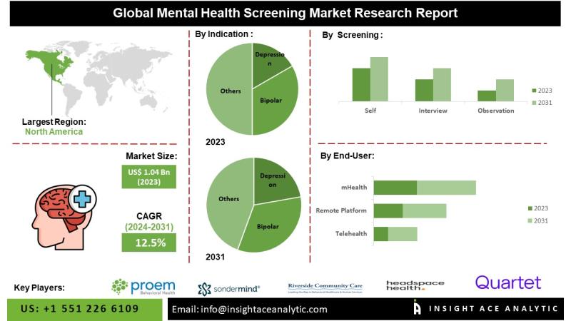 InsightAce Analytic Pvt. Ltd. announces the release of a market assessment report on the "Global Mental Health Screening Market- By Indication (Physiological Disorders, Psychiatric Disorders Behavioral Disorders Cognitive Disorders), Screening Method (Self-reported Questionnaires & Surveys, Clinical Interviews, Observation-based Assessments, Biomarker Testing)), By Technology, By Age Group, By Setting, By Region, Trends, Industry Competition Analysis, Revenue and Forecast To 2031."