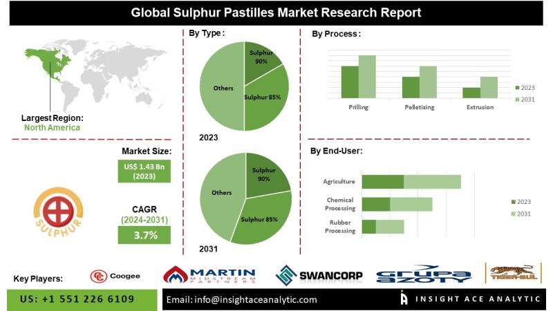 InsightAce Analytic Pvt. Ltd. announces the release of a market assessment report on the "Global Sulphur Pastilles Market- (By Type (Sulphur 90%, Sulphur 85%), Process (Prilling/Pelletizing, Extrusion, Others), Application (Agriculture, Chemical Processing, Rubber Processing, Pharmaceuticals and Others)), By Region, Trends, Industry Competition Analysis, Revenue and Forecast To 2031."According to the latest research by InsightAce Analytic, the Global Sulphur Pastilles Market is valued at US$ 1.43 Bn in 2023, and it is expected to reach US$ 1.90 Bn by 2031, with a CAGR of 3.7% during the forecast period of 2024-2031.