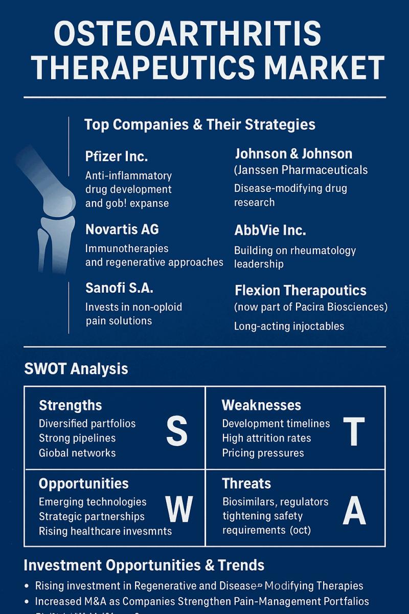 The osteoporosis therapeutics market continues to evolve as clinical innovation accelerates, patient expectations rise, and global healthcare systems prioritize disease-modifying solutions over symptomatic relief. Within this environment, companies operating across biologics, small-molecule drugs, intra-articular therapies, and regenerative medicine are redefining their competitive strategies. This article provides a comprehensive strategic analysis of the osteoarthritis therapeutics market, highlighting top companies, their competitive positioning, and emerging investment opportunities shaping the industry's next phase.