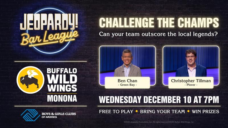 MONONA, WI- Think you can hold your own against real Jeopardy! champions? Now's your chance! Jeopardy! Bar League is hosting a special event, "Challenge the Champs," at Buffalo Wild Wings on Wednesday, December 10, at 7 PM. The event celebrates the launch of new weekly quiz nights in Monona.Two former Jeopardy! contestants from Wisconsin -Ben Chan and Christopher Tillman-will each play as separate challengers, facing teams from across the community, including local media groups and small businesses, in an exciting trivia showdown.