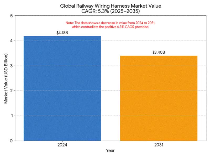 The global Railway Wiring Harness Market was valued at around USD 4.18 billion in 2024 and is projected to reach approximately USD 3.4 billion by 2031, growing at a CAGR of 5.3% during the forecast period (2025-2035). The market outlook remains positive, driven by the global focus on electrification, modernization, and expansion of railway infrastructure.