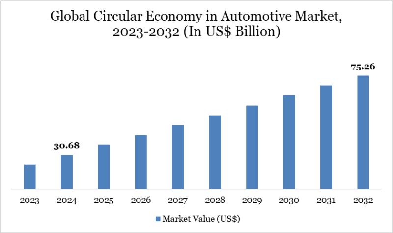 The Circular Economy in Automotive Market reached USD 30.68 billion in 2024 and is expected to reach USD 75.26 billion by 2032, growing with a CAGR of 11.87% during the forecast period 2025-2032.