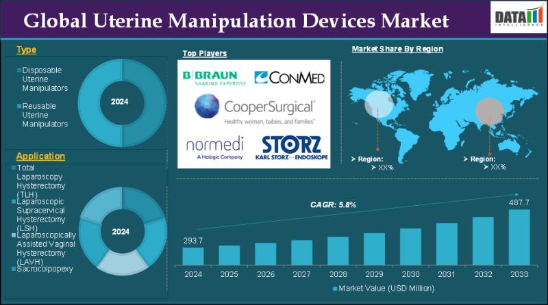 As per DataM intelligence research report" The global uterine manipulation devices market reached US$ 293.7 million in 2024 and is expected to reach US$ 487.7 million by 2033, growing at a CAGR of 5.8% during the forecast period 2025-203". Growth in minimally invasive gynecologic surgeries is increasing demand for uterine manipulation devices.