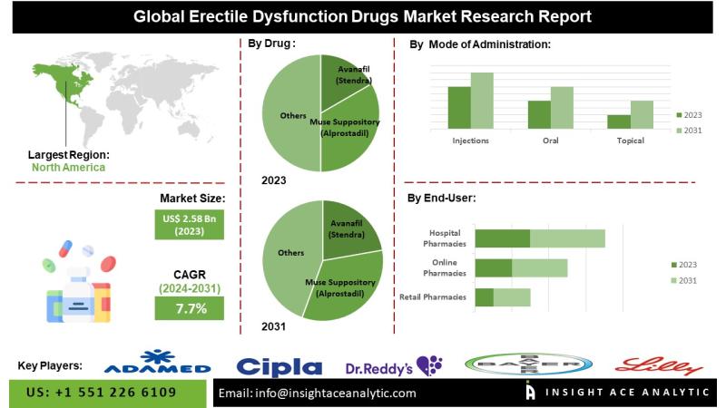 InsightAce Analytic Pvt. Ltd. announces the release of a market assessment report on the "Global Erectile Dysfunction Drugs Market Size, Share & Trends Analysis Report By Drug (Avanafil (Stendra), Muse Suppository (Alprostadil), Sildenafil (Viagra)), Mode of Administration (Injections, Oral, Topical), Distribution Channel (hospital pharmacies, online pharmacies, and retail pharmacies), Region, Market Outlook And Industry Analysis 2031"