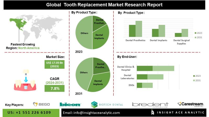 InsightAce Analytic Pvt. Ltd. announces the release of a market assessment report on the "Global Tooth Replacement Market- By Product [Dental Implants, Dental Prosthetics, Dental Surgical Supplies, CAD/CAM Systems and Dental Scanners], End-user [Dental Clinics & Hospitals, Dental Laboratories, Academic & Research Institutes]), By Region, Trends, Industry Competition Analysis, Revenue and Forecast To 2034."