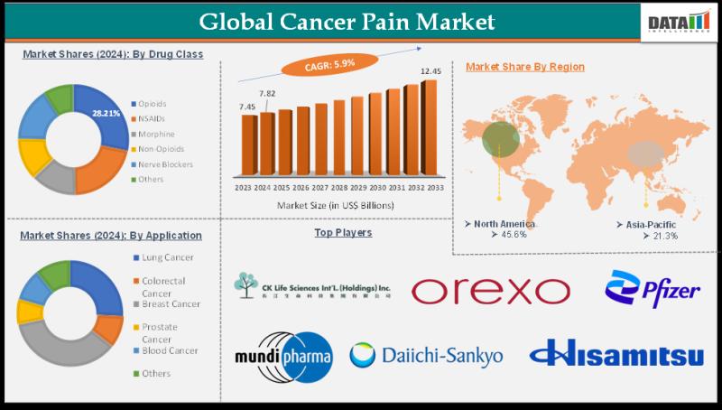 The global cancer pain market was valued at US$ 7.45 Billion in 2023. The market size reached US$ 7.82 Billion in 2024 and is expected to reach US$ 12.45 Billion by 2033, growing at a CAGR of 5.9% during the forecast period 2025-2033.