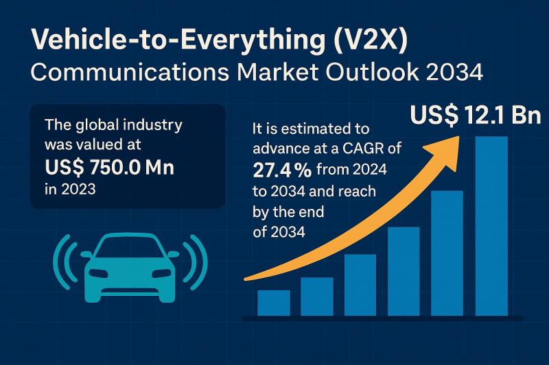 The global Vehicle-to-Everything (V2X) Communications Market is set for explosive growth over the next decade, according to a new report titled "Vehicle-to-Everything (V2X) Communications Market - Global Industry Analysis, Size, Share, Growth, Trends, and Forecast, 2024-2034." The study reveals that the V2X market, valued at US$ 750.0 million in 2023, is projected to expand at a CAGR of 27.4% from 2024 to 2034, reaching US$ 12.1 billion by 2034.
