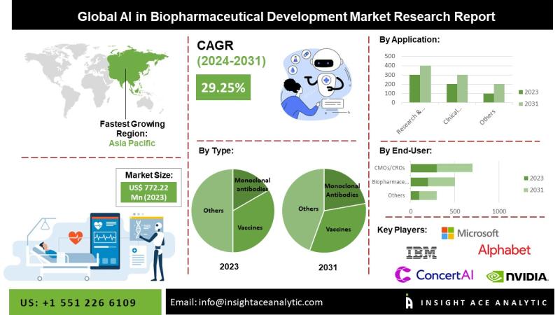 InsightAce Analytic Pvt. Ltd. announces the release of a market assessment report on the "Global AI in Biopharmaceutical Development Market- by Type (Monoclonal Antibodies, Vaccines, and Recombinant Proteins), Application (Research and Discovery, Clinical Development, Manufacturing & Supply Chain and Other Subsegments), End-User (Biopharmaceutical Manufacturers, Contract Manufacturing Organizations or Contract Research Organizations (CRO), and Academic & Government Research Institutes), Trends, Industry Competition Analysis, Revenue and Forecast To 2034."