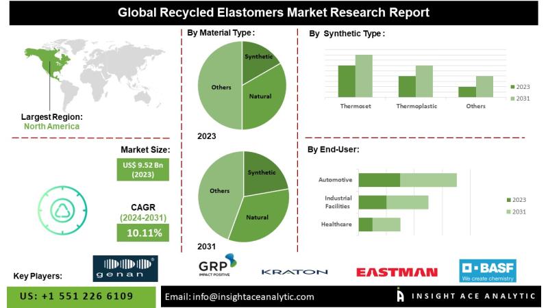 InsightAce Analytic Pvt. Ltd. announces the release of a market assessment report on the "Global Recycled Elastomers Market - (By Material Type (Synthetic and Natural), Synthetic Type (Thermoset and Thermoplastic), Thermoset (Recycled Rubber, Recycled Polyurethane, and Other Thermosets), Thermoplastic (Styrenic Block Copolymers (SBC), Thermoplastic Polyurethane (TPU), Thermoplastic Vulcanizate (TPV), and Other Thermoplastics), Application (Automotive, Industrial Facilities, Healthcare, Packaging, Construction, Consumer Goods, and Other Application)), Trends, Industry Competition Analysis, Revenue and…