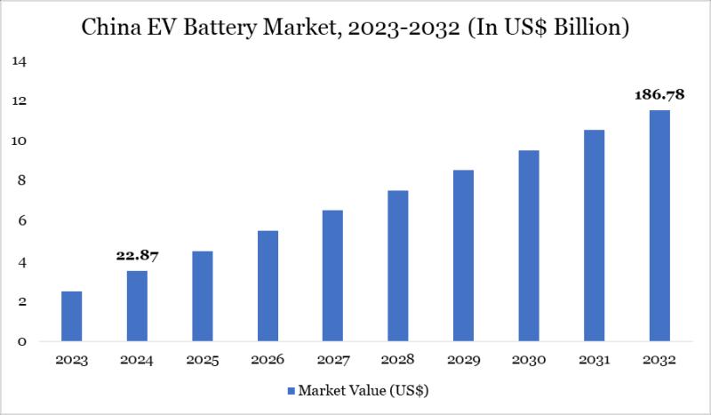 As per DataM intelligence research report" China EV Battery Market reached US$ 22.87 billion in 2024 and is expected to reach US$ 186.78 billion by 2032, growing with a CAGR of 30.02% during the forecast period 2025-2032." Strong EV production, technology upgrades, and government incentives are accelerating China's EV battery industry.