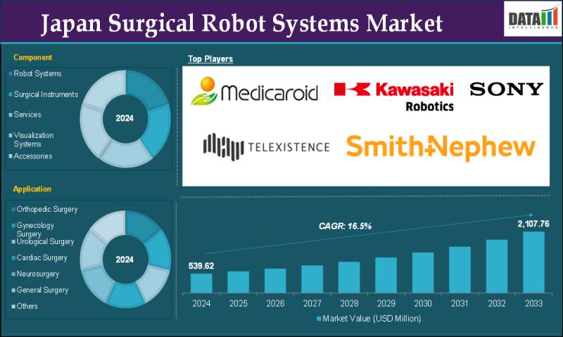 As per DataM intelligence research report" The Japan Surgical Robot Systems Market reached US$539.62 million in 2024 and is expected to reach US$2,093.77 million by 2033, growing at a CAGR of 16.9% during the forecast period of 2025-2033." Demand for precision surgery and minimally invasive procedures is driving growth in Japan's surgical robotics market.