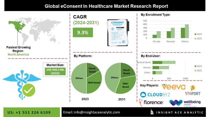 InsightAce Analytic Pvt. Ltd. announces the release of a market assessment report on the "Global eConsent In Healthcare Market - (By Platform (Cloud-based, Web-based), By Enrollment Type (On-Site, Remote), By Form Type (General Consent, General Consent with Specific Denial(S), General Denial with Specific Consent(S), General Denial)), Trends, Industry Competition Analysis, Revenue and Forecast To 2034."