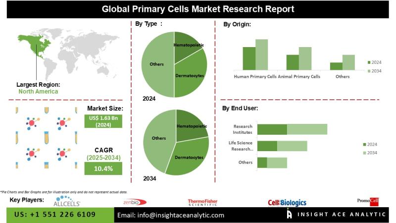 InsightAce Analytic Pvt. Ltd. announces the release of a market assessment report on the "Global Primary Cells Market- (By Type (Hematopoietic, Dermatocytes, Hepatocytes, Gastrointestinal, Lung, Renal, Heart, Musculoskeletal), Origin (Human Primary Cells, Animal Primary Cells), End User (Life Science Research Companies, Research Institutes, Others)), Trends, Industry Competition Analysis, Revenue and Forecast To 2034."