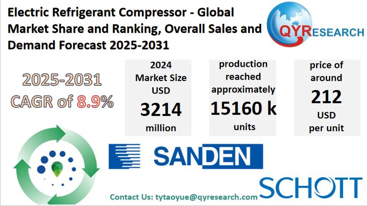 The global market for Electric Refrigerant Compressor was estimated to be worth US$ 3214 million in 2024 and is forecast to a readjusted size of US$ 6196 million by 2031 with a CAGR of 8.9% during the forecast period 2025-2031.
