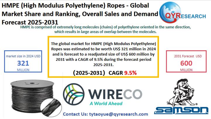 The global market for HMPE (High Modulus Polyethylene) Ropes was estimated to be worth US$ 321 million in 2024 and is forecast to a readjusted size of US$ 600 million by 2031 with a CAGR of 9.5% during the forecast period 2025-2031.