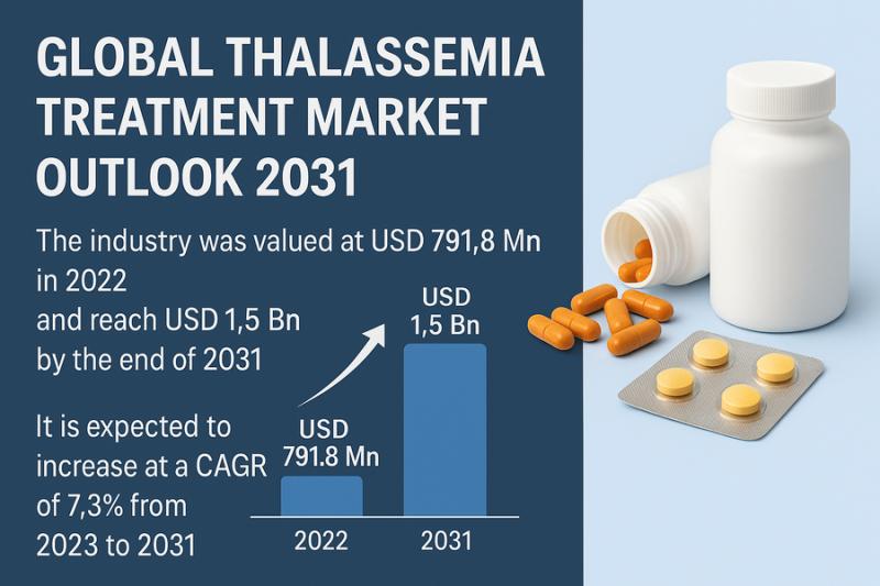 The global thalassemia treatment market, valued at USD 791.8 million in 2022, is projected to reach USD 1.5 billion by 2031, expanding at a CAGR of 7.3% from 2023 to 2031. Growth is fueled by rising disease prevalence, increasing access to advanced therapies, and ongoing developments in gene-based and curative treatment options.