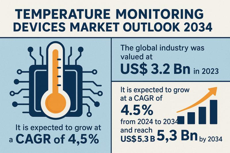 The global Temperature Monitoring Devices Market is undergoing a phase of robust evolution, backed by strong demand for accurate, real-time, and non-invasive temperature measurement solutions across clinical, wellness, and institutional environments. According to the latest industry assessment, the global temperature monitoring devices market-valued at US$ 3.2 Bn in 2023-is projected to reach US$ 5.3 Bn by 2034, expanding at a CAGR of 4.5% from 2024 to 2034.