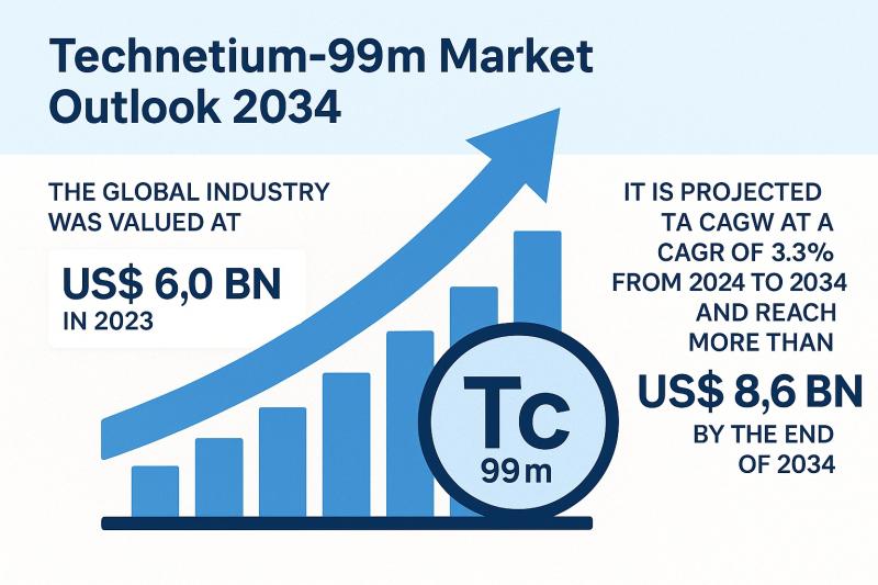 The global Technetium-99m market is entering a dynamic growth phase, supported by rising investments in healthcare infrastructure, advanced nuclear imaging technologies, and the escalating global burden of chronic and non-communicable diseases. According to the latest industry analysis, the market-valued at US$ 6.0 Bn in 2023-is projected to reach more than US$ 8.6 Bn by 2034, growing at a CAGR of 3.3% from 2024 to 2034.