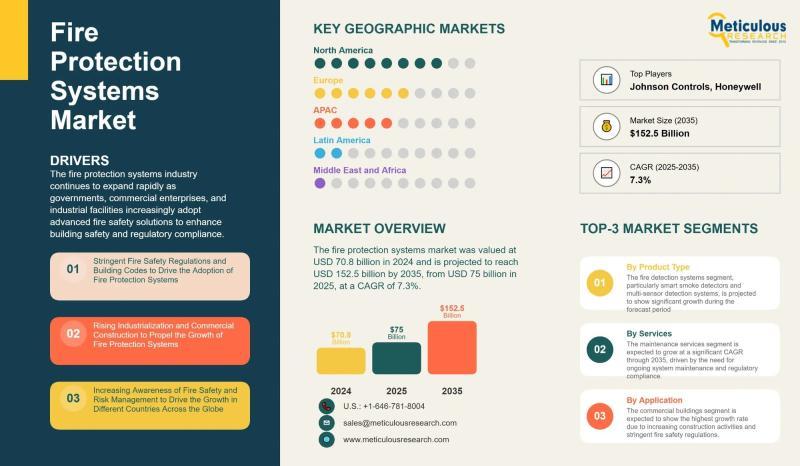 Meticulous Research®-a leading global market research company-has released its latest report titled "Fire Protection Systems Market Size, Share, Trends & Forecast by Product Type (Fire Detection, Suppression, Sprinkler Systems), Services (Installation, Maintenance, Managed), Application, and Region - Global Outlook 2025-2035."