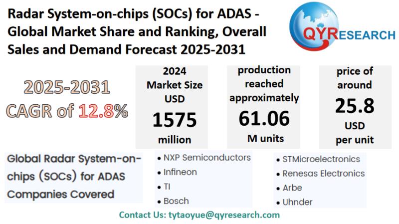 Global leading market research publisher QYResearch published the release of its latest report, "Radar System-on-chips (SOCs) for ADAS - Global Market Share, Ranking, Sales, and Demand Forecast 2025-2031". This in-depth report provides a complete analysis of the global Radar System-on-chips (SOCs) for ADAS market, offering critical insights into market size, share, demand, industry development status,…