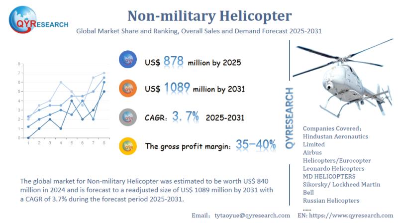Global leading market research publisher QYResearch published the release of its latest report, "Non-military Helicopter - Global Market Share, Ranking, Sales, and Demand Forecast 2025-2031". This in-depth report provides a complete analysis of the global Non-military Helicopter market, offering critical insights into market size, share, demand, industry development status, and future forecasts. Whether you're a stakeholder, investor, or…