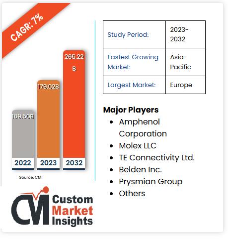As per the current market research conducted by CMI Team, the global Cable Assembly Market size is expected to record a CAGR of 7% from 2023 to 2032. In 2023, the market size is projected to reach a valuation of USD 169.50 billion. By 2032, the valuation is anticipated to reach USD 265.22 billion.