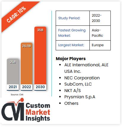 According to Custom Market Insights (CMI), the Global Submarine Cable Market was estimated at USD 25 billion in 2021 and is anticipated to reach around USD 35 billion by 2030, growing at a CAGR of roughly 10% between 2022 and 2030. Our research report offers a 360-degree view of the Submarine Cable market's drivers and restraints, coupled with the impact they have on demand during the projection period. Also, the…