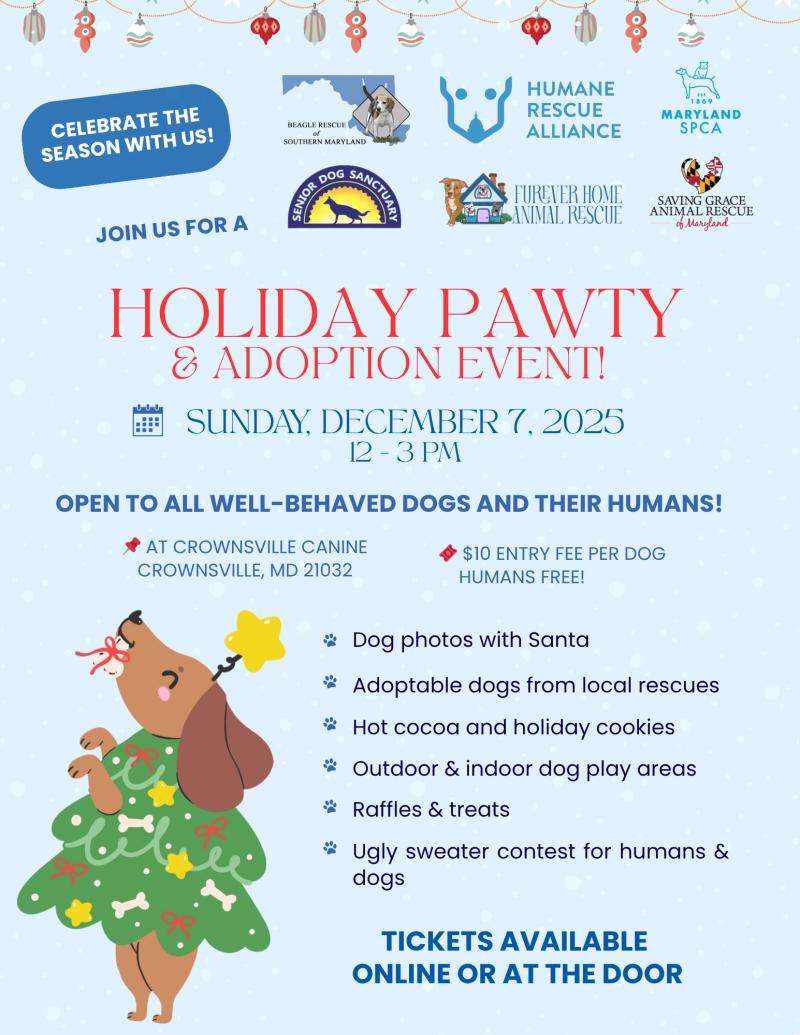 The 2025 Holiday Pawty & Adoption Event (https://beaglemaryland.org/holiday25/) will be a howling good time, and perhaps the biggest adoption event of the year. The holidays are all about community, and what better way to celebrate than by supporting multiple rescues at once?! Community members are invited to bring their furry family members to the party, which includes: